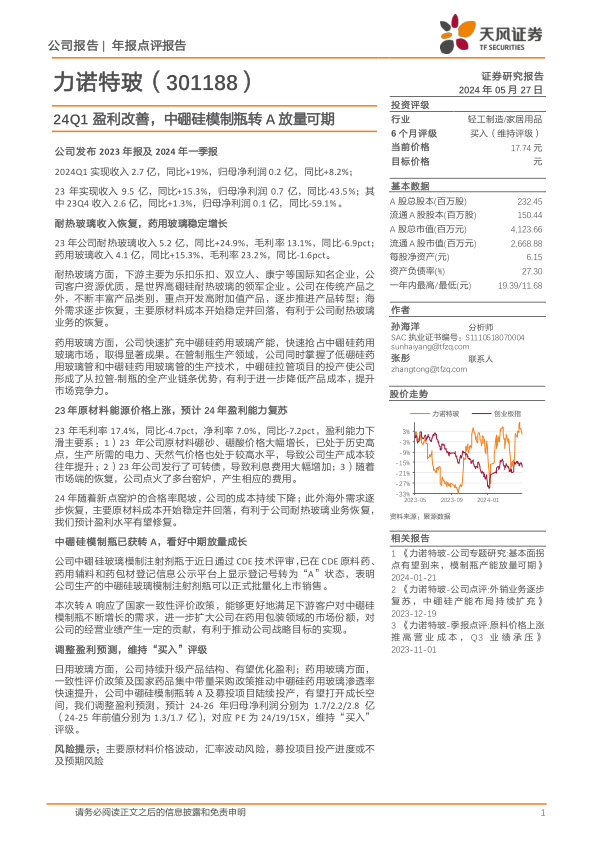 本报告分析了力诺特玻2023年及2024年一季度的业绩表现,并对公司的主要业务进行了详细解读。报告强调,随着原材料成本的稳定和海外需求的恢复,公司盈利能力有望复苏。此外,中硼硅模制瓶转A将为公司带来新的增长机遇,有望受益于国家政策和市场需求的双重驱动。基于以上分析,天风证券维持对力诺特玻“买入”的投资评级。