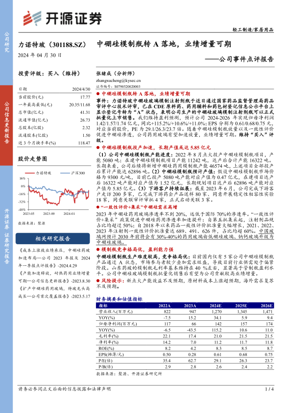 事件:力诺特玻中硼硅玻璃模制注射剂瓶于近日通过国家药品监督管理局药品审评中心技术评审,已在CDE原料药、药用辅料和药包材登记信息公示平台上显示登记号转为“A”状态,表明公司生产的中硼硅玻璃模制注射剂瓶可以正式批量化上市销售。我们维持盈利预测,预计公司2024-2026年实现归母净利润1.42/1.57/1.74亿元,同比+115.2%/+10.6%/+11.0%;EPS分别为0.61/0.68/0.75元,对应当前股价,PE为29.1/26.3/23.7倍。随着中硼硅模制瓶放量以及一致性评价促进中硼硅渗透,公司药用玻璃有望加速放量,业绩增量可期。维持“买入”评级。