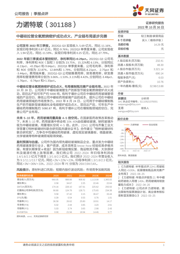 盈利预测与估值:公司作为国内领先硼硅玻璃制品企业,重点发力中硼硅药用玻璃享受行业β,客户资源、成本效率及know-how经验优势多维共振,有望长期享受α收益!因为新冠疫情反复、海运物流不畅、大宗原材料及能源价格上涨等因素,我们将公司2022-2024年归母净利润由1.4/1.8/2.3亿元下调至1.3/1.8/2.3亿元。我们预计2022-2024年营业收入为9.1/11.1/13.7亿元,同比+2%/+22%/+23%,归母净利润1.3/1.8/2.3亿元,同比+3%/+36%/+33%,2022-2024年PE分别为26X/19X/14X。