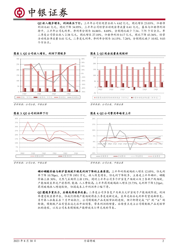 公司于8月29日发布2023年中报,Q2公司收入增长27.10%,但受制于成本上行以及新点火及炉窑爬坡不及预期,利润率下滑较多,我们预计Q3炉窑顺利达产后,公司业绩将逐步修复,维持增持评级。