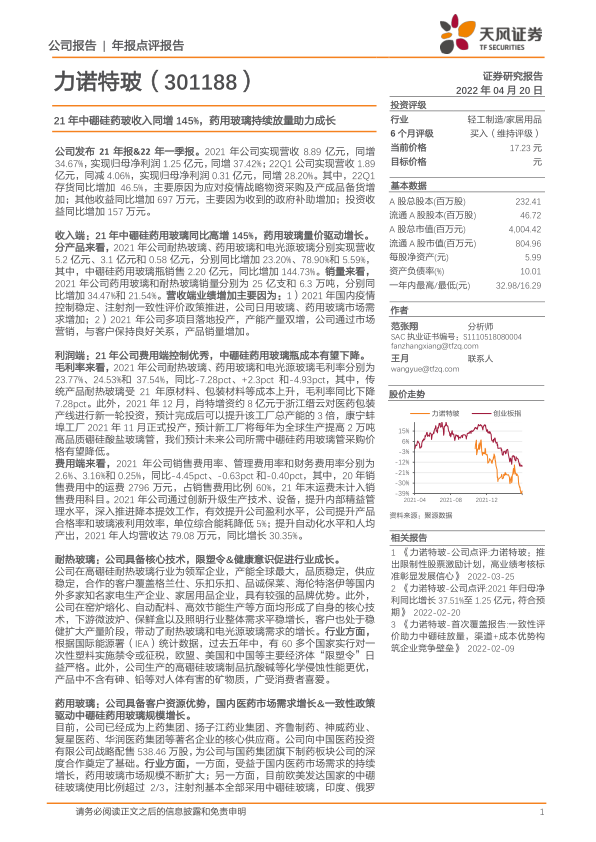 力诺特玻在2021年展现出强劲的业绩增长势头,尤其在中硼硅药用玻璃领域实现了爆发式增长,成为公司业绩的核心驱动力。这得益于国内医药市场需求的增长、注射剂一致性评价政策的推动以及公司在产能扩张和精益管理方面的努力。公司在耐热玻璃和药用玻璃两大核心业务上均具备显著的竞争优势,并通过持续的产能扩张和技术创新,有望在未来几年继续享受行业红利,实现稳健增长。尽管面临原材料进口、股价波动和市场竞争等风险,但公司凭借其客户资源、成本效率和专业经验,预计将持续获得超额收益。