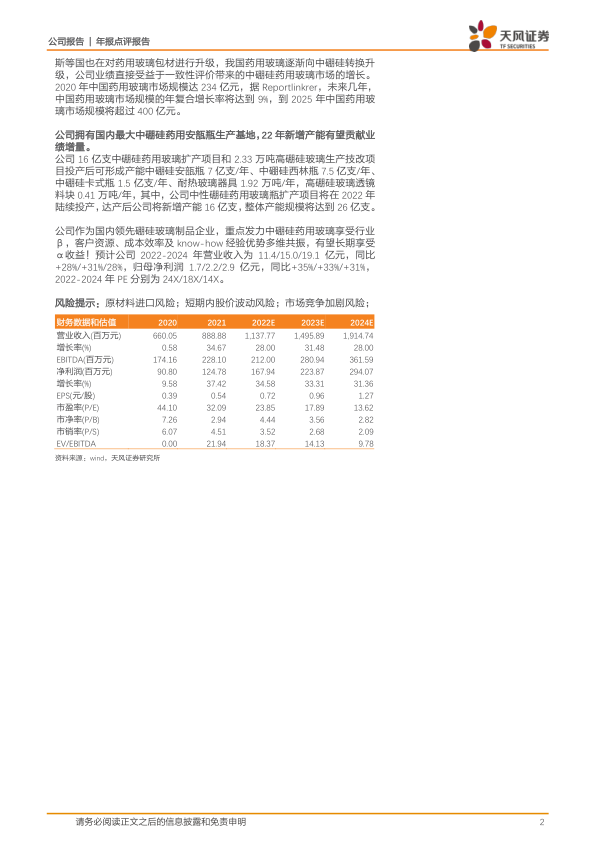 公司作为国内领先硼硅玻璃制品企业,重点发力中硼硅药用玻璃享受行业β,客户资源、成本效率及know-how经验优势多维共振,有望长期享受α收益!预计公司2022-2024年营业收入为11.4/15.0/19.1亿元,同比+28%/+31%/28%,归母净利润1.7/2.2/2.9亿元,同比+35%/+33%/+31%,2022-2024年PE分别为24X/18X/14X。