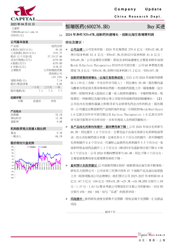 恒瑞医药2024年业绩表现强劲,营收和净利润均实现显著增长,这主要得益于创新药销售的快速增长以及创新药海外授权交易带来的收入。公司各产品线毛利率均有提升,期间费用率下降,盈利能力增强。 预计未来三年公司将有大量创新产品及适应症获批上市,持续推动业绩增长。维持“买进”评级,但需关注新药研发进度、授权兑现以及汇兑损益等风险。