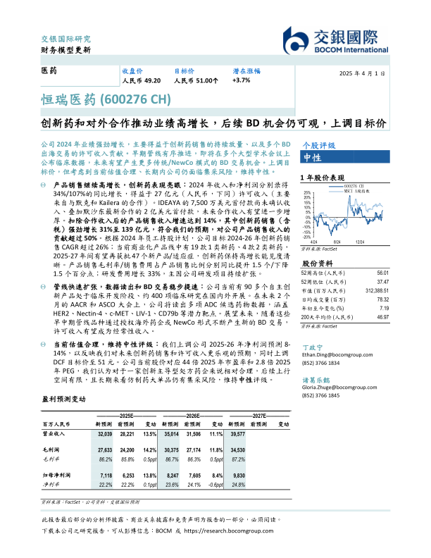 本报告分析了恒瑞医药2024年的业绩表现,认为创新药销售和对外合作是业绩增长的主要驱动力。公司管线快速扩张,未来BD交易机会可观。交银国际上调了对公司未来盈利的预测,但考虑到估值和集采风险,维持“中性”评级。
