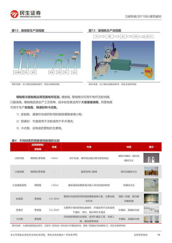 力诺药玻:跨越从0到1,掘金中硼硅模制瓶。管制瓶的先发优势:公司管制瓶基础夯实,近年来不断扩产,提高玻管自给率进一步降本。公司在设立之初就就开始从事管制瓶的生产,截至2023Q1末,公司的低硼硅管制瓶年化产能达到20.7亿支(较2022年产能+2.5亿支),中硼硅管制瓶年化产能达到25.8亿支(较2022年产能+8.7亿支)。2022年10月28日,公司中硼硅药用玻璃管拉管项目窑炉正式点火,投产后预计能年产中硼硅药用玻璃管约5000吨,进一步完善了公司产业链条,降低公司中硼硅药用玻璃产品的成本,有效提升公司在中硼硅药用玻璃领域的市场竞争力。中硼硅模制瓶的后发优势:目前正当中硼硅国产化的关键阶段,公司把握机遇,积极扩大产能布局。公司首期中硼硅模制瓶项目已于22年8月点火,可年产中硼硅模制瓶约5080吨,其他在建项目有望在2024年年底前全部建成,投产后公司中硼硅模制瓶产能将达到6.3万吨/年。2024年4月30日,公司公告中硼硅玻璃模制注射剂瓶(5ml-500ml)已完成转A,表明公司生产的中硼硅玻璃模制注射剂瓶可以正式批量化上市销售。