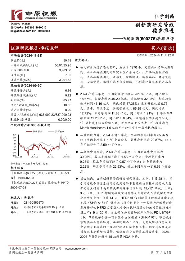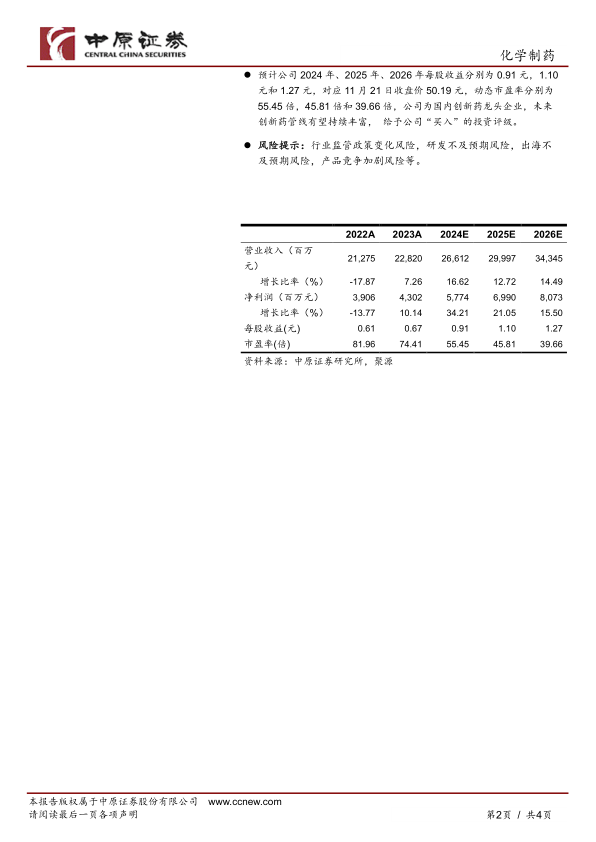 预计公司2024年、2025年、2026年每股收益分别为0.91元,1.10元和1.27元,对应11月21日收盘价50.19元,动态市盈率分别为55.45倍,45.81倍和39.66倍,公司为国内创新药龙头企业,未来创新药管线有望持续丰富,给予公司“买入”的投资评级。