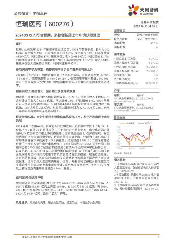 本报告分析了恒瑞医药2024年第三季度业绩,指出公司收入符合预期,创新药收入高速增长,研发成果持续兑现,多款创新药上市申请获得受理。考虑到创新药持续放量,上调了公司未来收入及盈利预测,并维持“买入”评级。同时,报告也提示了政策变动、研发失败、经营及市场竞争加剧等风险。