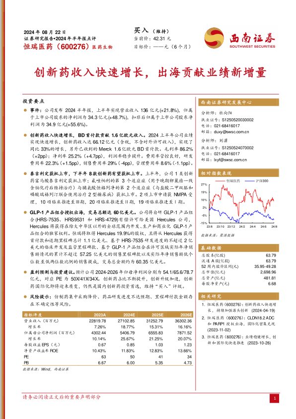 恒瑞医药2024年半年报显示,公司业绩实现强劲增长,营业收入和净利润均大幅提升,主要得益于创新药业务的快速发展和国际化战略的显著成效。公司创新药收入占比持续提高,多款新药及新适应症获批上市,研发管线丰富且进展顺利。特别是GLP-1产品组合的国际化授权交易,总金额高达60.35亿美元,标志着公司在全球市场拓展方面取得重大突破,为未来业绩增长奠定了坚实基础。公司财务表现稳健,利润率持续提升,费用控制良好。尽管面临仿制药集采降价、研发进度不确定性及里程碑付款风险,但凭借其强大的创新能力和国际化布局,恒瑞医药仍被分析师视为国内创新药领域的投资首选,预计未来几年公司盈利能力将持续提升,保持稳健增长态势。