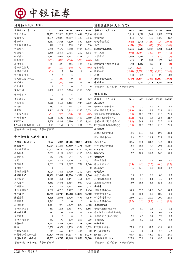 本报告对恒瑞医药(600276.SH)2023年年报和2024年一季报进行了分析,核心观点如下: