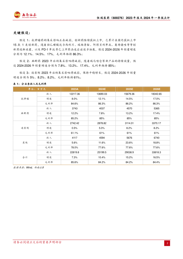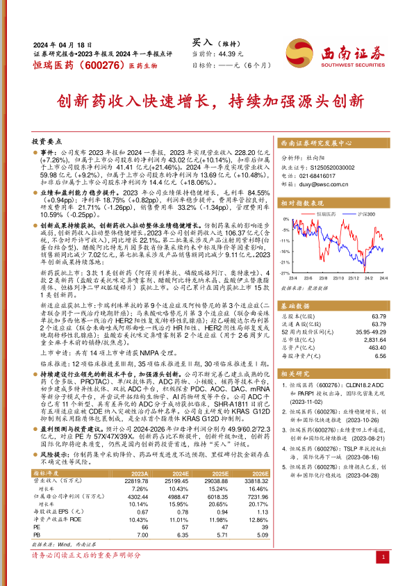 本报告分析了恒瑞医药2023年报和2024年一季报,核心观点如下: