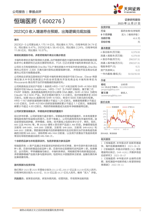 本报告对恒瑞医药(600276)2023年第三季度业绩进行了分析,并维持“买入”评级。核心观点如下: