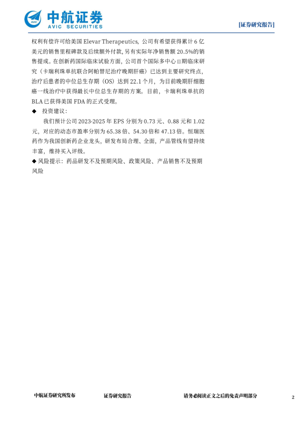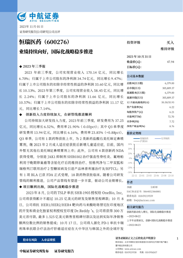2023年8月,公司的TSLP单抗SHR-1905授权给OneBio,Inc,公司将获得累计不超过10.25亿美元的研发及销售里程碑款;10月8日,公司将抗HER1/HER2/HER4靶向药马来酸吡咯替尼在印度地区的开发和商业化独家权利授权至印度Dr.Reddy's,公司将获得300万美元首付款、最多1.525亿美元销售里程碑付款以及达到实际年净销售额两位数比例的销售提成;10月17日,公司将人源化PD-1单抗卡瑞利珠单抗联合疗法治疗肝癌适应症在大中华区与韩国之外的全球开发权利有偿许可给美国ElevarTherapeutics,公司有希望获得累计6亿美元的销售里程碑款及后续额外付款,另有实际年净销售额20.5%的销售提成。在创新药国际临床试验方面,公司首个国际多中心Ⅲ期临床研究(卡瑞利珠单抗联合阿帕替尼治疗晚期肝癌)已达到主要研究终点,治疗后患者的中位总生存期(OS)达到22.1个月,为目前晚期肝细胞癌一线治疗中获得最长中位总生存期的方案。目前,卡瑞利珠单抗的BLA已获得美国FDA的正式受理。