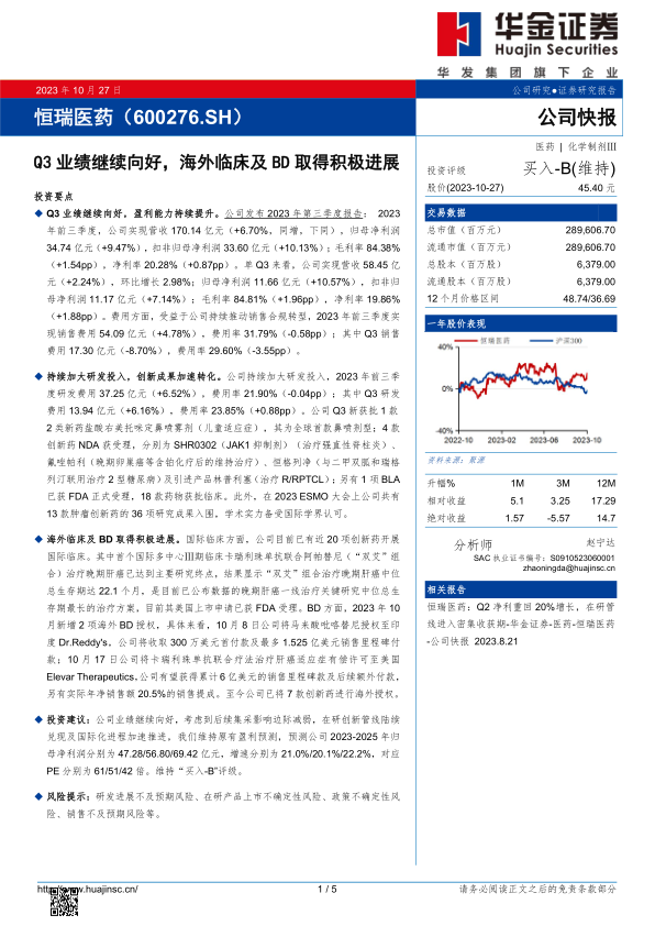 恒瑞医药在2023年第三季度展现出稳健的业绩增长和盈利能力的提升,这得益于公司持续的研发投入和创新成果的加速转化。同时,公司在海外临床和BD方面也取得了积极进展,国际化进程不断推进。综合来看,恒瑞医药未来的发展前景值得期待,但同时也需关注研发、政策和市场销售等方面的风险。