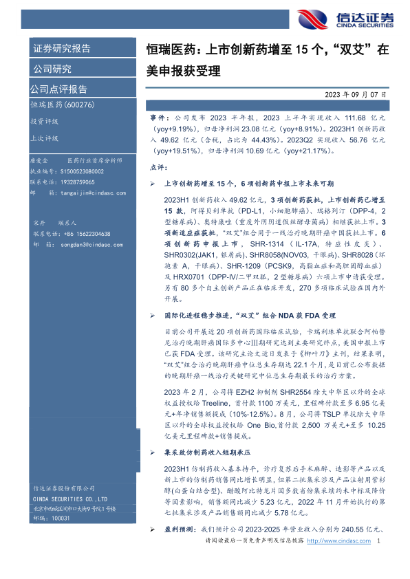 事件 : 公司发布 2023 半年报, 2023 上半年实现收入 111.68 亿元(yoy+9.19%),归母净利润 23.08 亿元(yoy+8.91%)。 2023H1 创新药收入 49.62 亿元(含税,占比为 44.43%)。 2023Q2 实现收入 56.76 亿元(yoy+19.51%),归母净利润 10.69 亿元(yoy+21.17%)。
