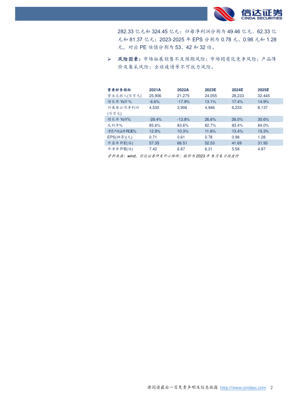风险因素: 市场拓展销售不及预期风险;市场同质化竞争风险;产品降价及集采风险;全球疫情等不可抗力风险