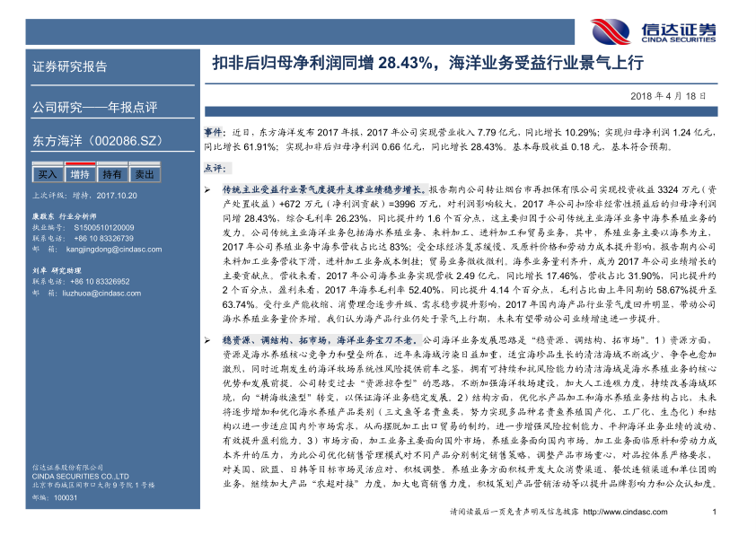 东方海洋2017年业绩表现亮眼,扣非后归母净利润同比增长28.43%,主要得益于海参养殖业务的强劲增长和海产品行业景气度的提升。公司通过“稳资源、调结构、拓市场”的策略,持续优化海洋业务结构,增强核心竞争力。同时,公司在大健康领域构建了“4+2+3”的产业蓝图,并积极推进产品研发和市场拓展,尽管目前大健康业务尚处于起步阶段,但其有望成为公司未来新的业绩增长点。公司整体呈现出传统主业稳健发展与新兴业务积极布局的双轮驱动态势,未来增长潜力值得关注,但需警惕研发、市场及自然灾害等潜在风险。