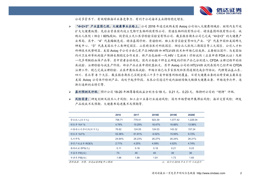 公司预计2018-2020年摊薄每股收益分别为0.18元、0.21元、0.23元,维持“增持”评级。同时,报告提示了研发创新及技术人才、加工出口业务行业波动、国内市场营销开展滞后、海洋灾害、研发产品投放不及预期以及大健康布局进展不及预期等风险因素。