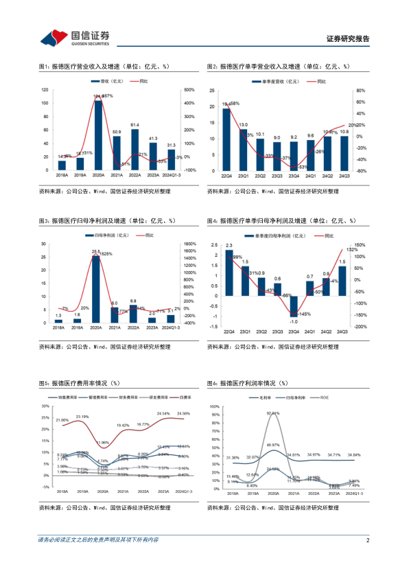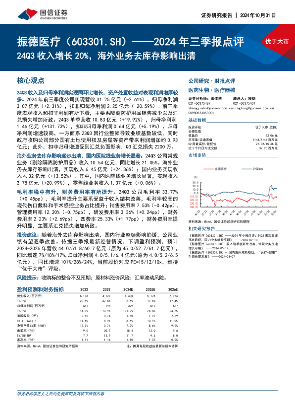 本报告核心观点指出,振德医疗在2024年第三季度实现了营收和归母净利润的同环比增长,显示出业绩的显著回暖。这主要得益于海外业务去库存影响的逐步出清以及国内医院线业务的强劲增长。尽管前三季度整体业绩受隔离防护用品销售减少及汇兑损失增加影响有所下滑,但Q3单季表现已呈现积极拐点。