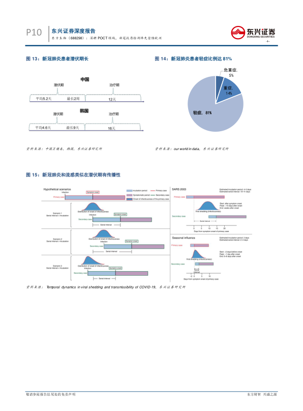 当前,非药物干预(检测、隔离)仍是遏制新冠病毒传播的唯一有效手段。研究表明,新冠病毒的流行可能长期持续至2022年,期间需要不同程度的社交隔离和持续检测。新冠肺炎与季节性流感传播期重合,且患者潜伏期长(平均5.2天/4.6天),轻症患者比例高达81%,这些特点都加大了防疫难度,对高效、便捷的检测手段提出了更高要求。