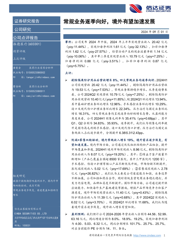 院端+零售双轮驱动,境内常规收入增长19%,境外需求逐步恢复,有望加速发展。境内市场方面,公司通过优化组织结构和产品组合,提升市场覆盖和渗透,2024H1境内市场实现收入8.96亿元,剔除隔离防护用品后收入为8.07亿元(yoy+19.20%),其中:①得益于客户数量不断增加(产品已覆盖全国超8500家医院,其中三甲医院约1200家),手术感控、伤造口护理等核心产品不断优化升级,市场份额不断提升,医院端实现收入5.02亿元(yoy+17.69%);②零售端实现收入2.78亿元(yoy+26.82%),我们认为主要是公司渠道能力加强,业务边界不断拓展,公司加强和药店合作,同时传统直营电商业务稳扎稳打,并发力内容电商,品牌知名度不断提升。国际市场方面,公司通过提升供应链能力、加快海外生产基地建设等措施,增强产品市场竞争力和客户满意度,境外市场实现营业收入11.40亿元(yoy+0.43%),剔除隔离防护用品后收入为11.39亿元(yoy+0.68%),其中2024Q2实现收入6.02亿元(yoy+3.70%),较2024Q1环比增长11.68%,我们认为随着境外需求逐步恢复,境外收入增长有望加快。