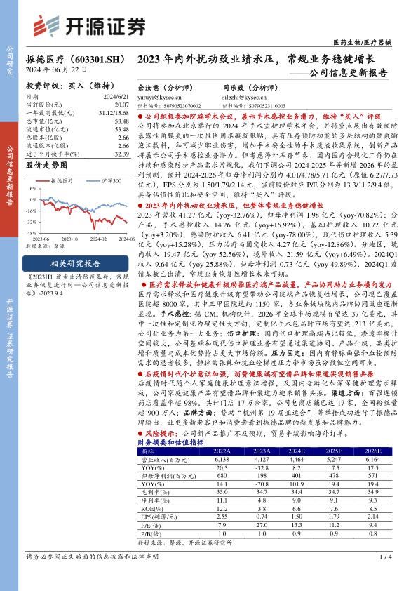 开源证券维持振德医疗“买入”评级。鉴于海外库存消化节奏、国内医疗合规化工作的持续推进以及感染防护产品需求常态化,研究团队下调了公司2024-2025年的盈利预测,并新增了2026年的预测。预计2024-2026年归母净利润分别为4.01亿元、4.78亿元和5.71亿元(原预测2024-2025年为6.27亿元、7.73亿元),对应EPS分别为1.50元、1.79元和2.14元。当前股价对应的P/E分别为13.3倍、11.2倍和9.4倍,具备估值性价比和安全空间。公司积极参与院端学术会议,重点展出一次性医用水凝胶眼贴、聚氨酯泡沫敷料和手术废液收集系统等创新产品,展示了手术感控业务的巨大潜力。