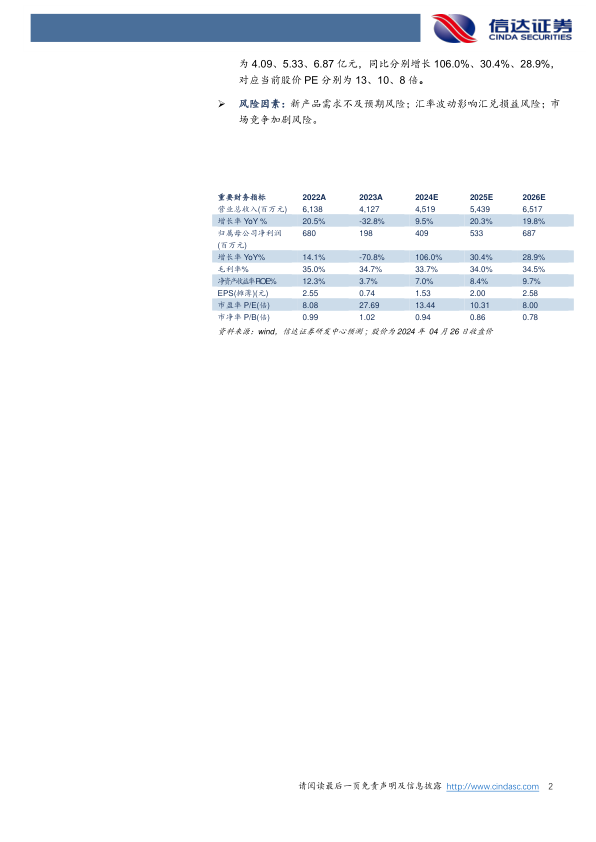 风险因素:新产品需求不及预期风险;汇率波动影响汇兑损益风险;市场竞争加剧风险。