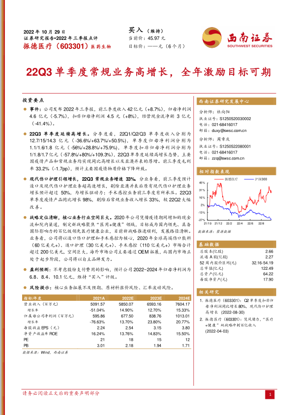 本报告对振德医疗2022年三季报进行了深入分析,指出公司在疫情产品和常规业务的驱动下,22Q3单季度延续高增长态势。现代伤口护理业务表现亮眼,战略定位清晰,市场空间广阔。维持“买入”评级,但需关注相关风险。