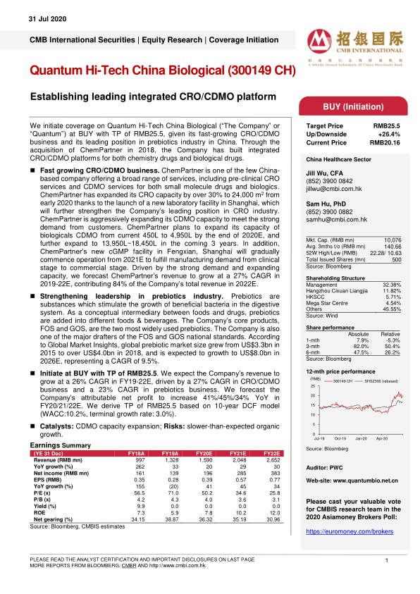 本报告对康龙化成(Quantum Hi-Tech China Biological,300149 CH)进行了覆盖,并给出了“买入”评级,目标价为人民币25.5元。报告的核心观点如下: