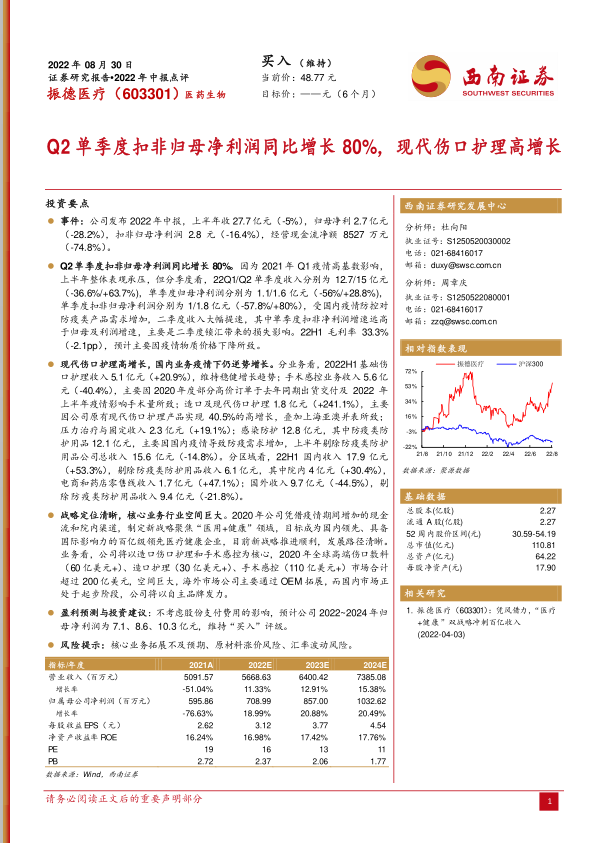 本报告分析了振德医疗(603301)2022年中报,核心观点如下: