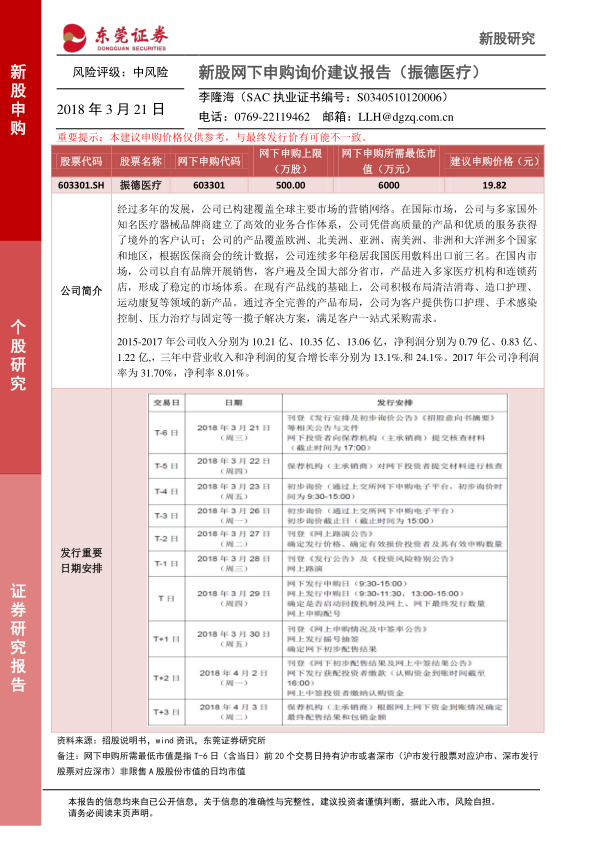 本报告对振德医疗进行了新股申购价值分析,建议申购价格为19.82元。报告强调了公司在全球和国内市场的布局,以及齐全的产品线和一站式解决方案。同时,报告分析了公司过去三年的财务数据,指出公司营业收入和净利润均保持增长,并具有较高的净利润率。总体而言,报告认为振德医疗具有良好的市场前景和投资价值。