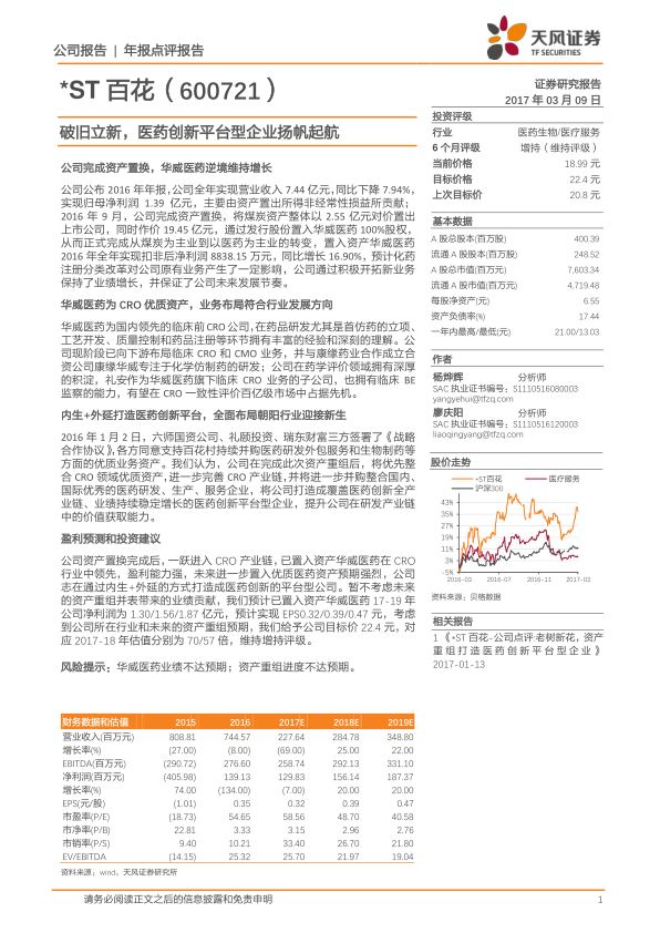 本报告对 *ST 百花(600721)进行了年报点评,核心观点是公司通过资产置换成功转型为医药创新平台型企业。华威医药作为置入的 CRO 优质资产,其业务布局符合行业发展方向,有望在一致性评价市场中占据先机。公司计划通过内生增长和外延并购,整合 CRO 领域优质资产,打造覆盖医药创新全产业链的平台型企业。报告维持对公司的增持评级,并给出了相应的盈利预测和目标价。同时,报告也提示了华威医药业绩不达预期和资产重组进度不达预期的风险。