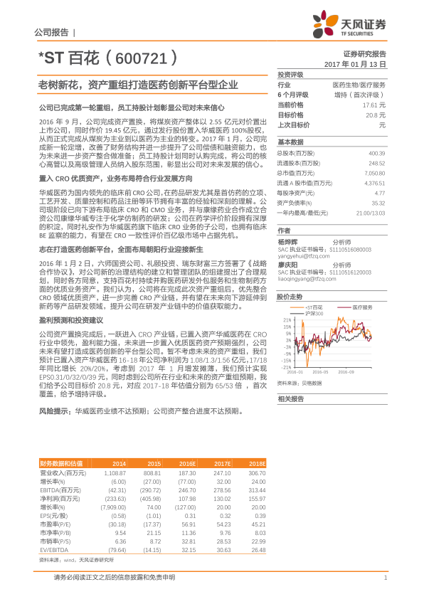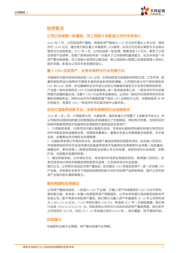 公司资产置换完成后,进入 CRO 产业链,已置入资产华威医药在 CRO 行业中领先,盈利能力强,未来进一步置入优质医药资产预期强烈,公司未来有望打造成医药创新的平台型公司。暂不考虑未来的资产重组,预计已置入资产华威医药 16-18 年公司净利润为 1.08/1.3/1.56 亿元,17/18 年同比增长 20%/20%,考虑到 2017 年 1 月增发摊薄,预计实现 EPS0.31/0/32/0/39 元,同时考虑到公司所在行业和未来的资产重组预期,给予公司目标价 20.8 元,对应 2017-18 年估值分别为 65/53 倍,首次覆盖,给予增持评级。