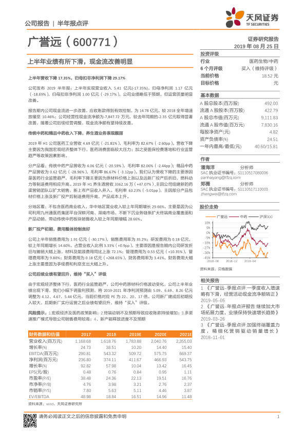 本报告对广誉远(600771)2019年半年度报告进行了分析,核心观点如下: