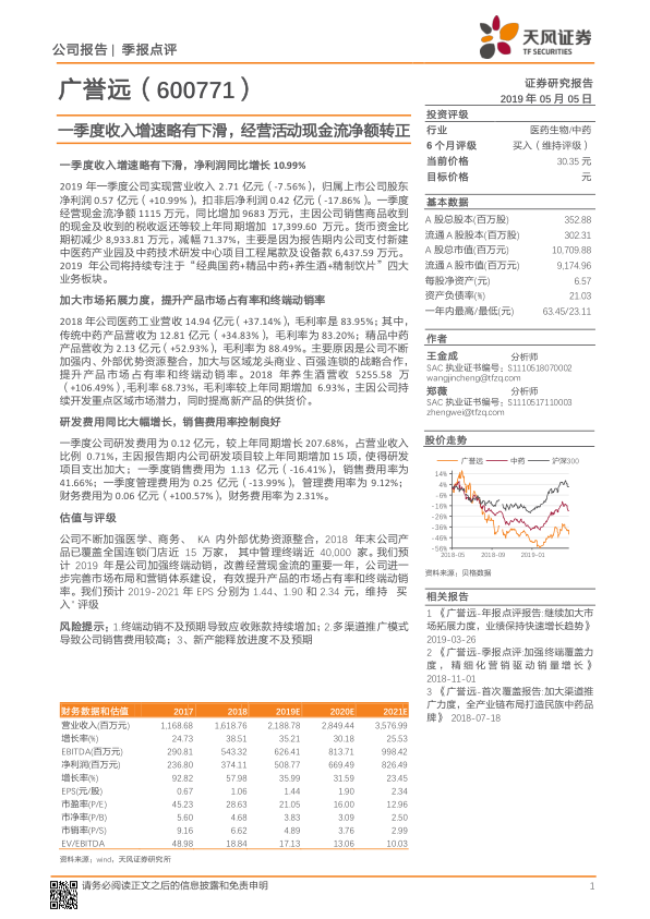 本报告对广誉远(600771)2019年一季度业绩进行了分析,并维持“买入”评级。核心观点如下: