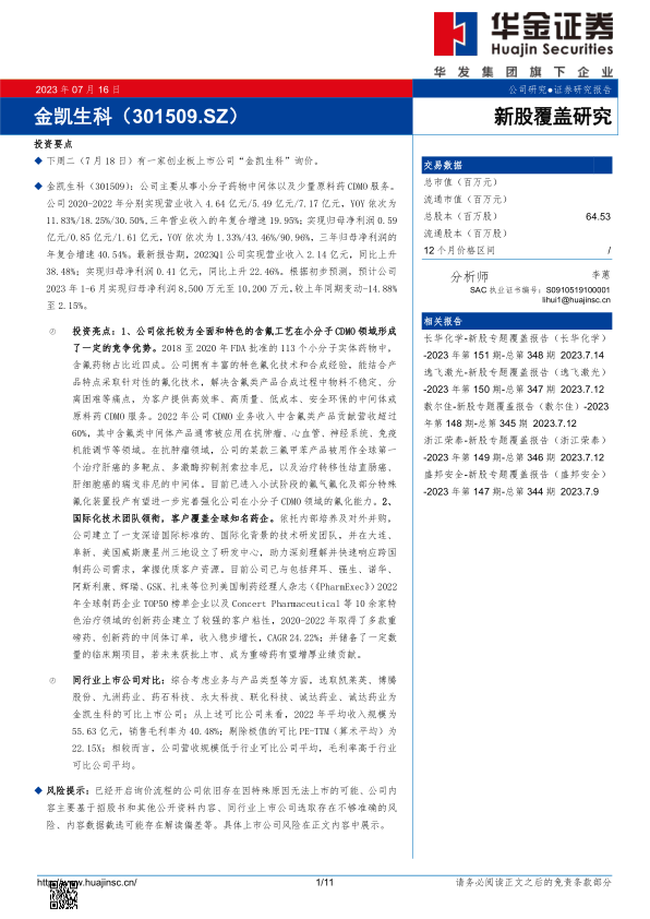 金凯生科(301509):公司主要从事小分子药物中间体以及少量原料药CDMO服务。公司2020-2022年分别实现营业收入4.64亿元/5.49亿元/7.17亿元,YOY依次为11.83%/18.25%/30.50%,三年营业收入的年复合增速19.95%;实现归母净利润0.59亿元/0.85亿元/1.61亿元,YOY依次为1.33%/43.46%/90.96%,三年归母净利润的年复合增速40.54%。最新报告期,2023Q1公司实现营业收入2.14亿元,同比上升38.48%;实现归母净利润0.41亿元,同比上升22.46%。根据初步预测,预计公司2023年1-6月实现归母净利润8,500万元至10,200万元,较上年同期变动-14.88%至2.15%。