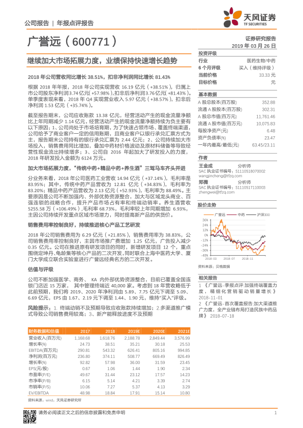 广誉远2018年业绩表现亮眼,营收和利润均实现显著增长,这主要得益于公司在市场拓展方面的持续努力和“传统中药+精品中药+养生酒”三驾马车战略的有效实施。尽管公司在现金流方面面临一定压力,且未来业绩预测有所下调,但天风证券依然维持“买入”评级,显示出对公司长期发展的信心。投资者应关注公司应收账款、销售费用以及产能释放等方面的风险。