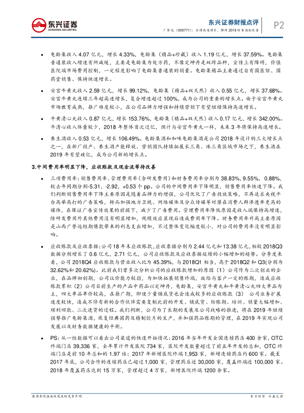 本报告的核心观点是广誉远在2018年实现了业绩的快速增长,尤其是在精品中药和养生酒方面表现突出。但同时,应收账款增加和现金流紧张等财务问题也需要关注。报告认为,随着新厂投产、产能释放以及公司战略的推进,广誉远有望在2019年实现业绩增长和财务指标改善的平衡。