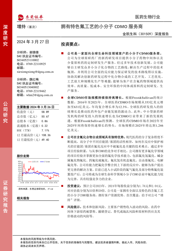 投资建议:预计公司2023年、2024年每股收益分别为1.76元和2.04元,对应估值分别为33倍和29倍。公司是一家拥有全面以及特色的含氟工艺的小分子CDMO服务商,拥有客户资源优势。首次覆盖,给予对公司“增持”评级。