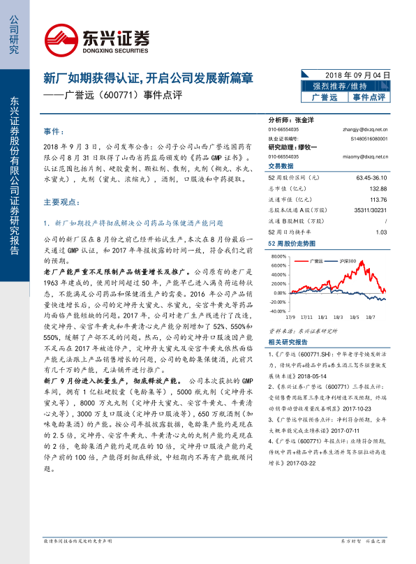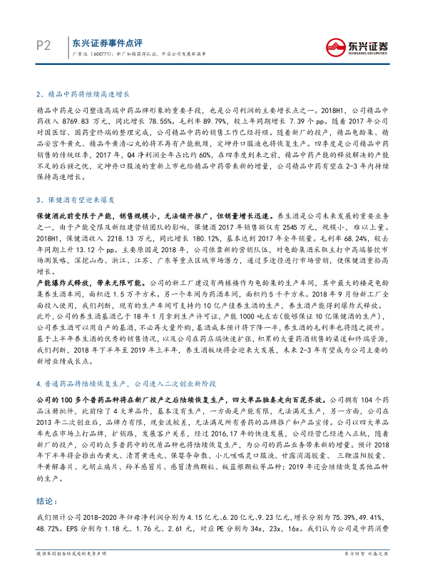 广誉远(600771)新厂的如期获得GMP认证并投产,是公司发展历程中的里程碑事件,彻底解决了长期困扰的产能瓶颈问题。这一突破为公司精品中药、保健酒和普通药品三大业务板块的全面高速增长奠定了坚实基础。精品中药将凭借产能保障和市场旺季效应持续高增长;保健酒业务在产能爆炸式释放和新营销策略的推动下,有望实现业绩爆发,成为新的利润增长极;同时,公司百余个普药品种的陆续恢复生产,将进一步丰富产品线,推动公司进入“二次创业”的“百花齐放”新阶段。东兴证券基于对公司强大护城河、核心产品竞争优势以及未来增长潜力的判断,维持“强烈推荐”评级,并预计公司未来三年归母净利润将保持高速增长。尽管存在传统中药增速放缓、保健酒推广不及预期及现金流改善不及时的风险,但新厂投产带来的积极影响预计将显著提升公司的市场竞争力和盈利能力。