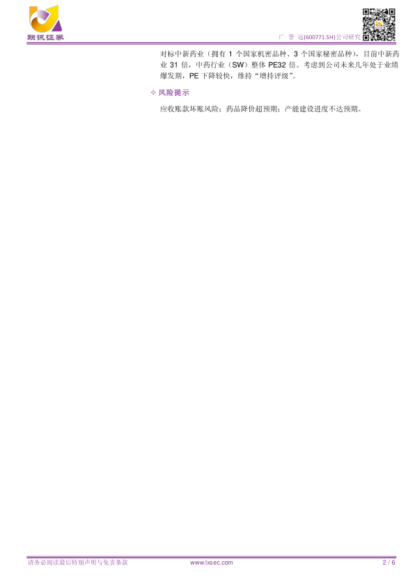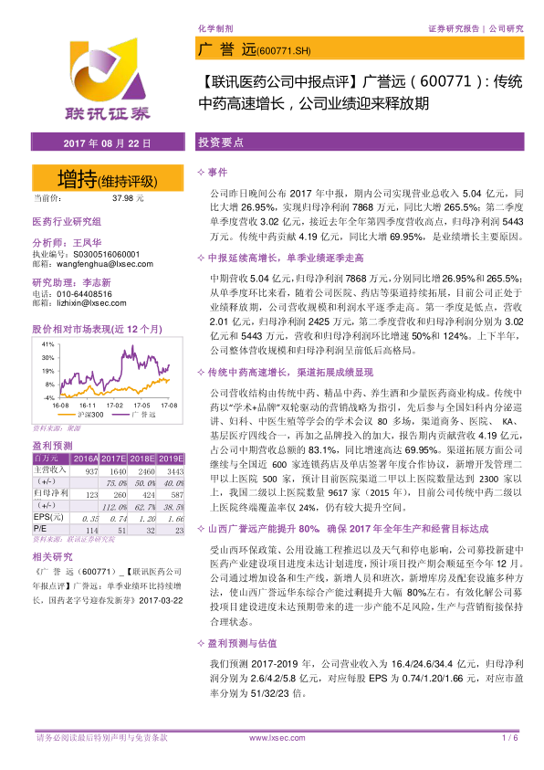 本报告对广誉远(600771.SH)2017年中报进行了深入分析,指出公司上半年业绩实现高速增长,营业收入和归母净利润分别同比增长26.95%和265.5%。业绩增长的核心驱动力在于传统中药业务的强劲表现,其营收占比超过83%,增速高达69.95%。公司通过“学术+品牌”的营销策略和多渠道拓展,显著提升了市场覆盖率,尤其在医院渠道方面仍有巨大发展潜力。为应对募投项目延迟,公司已通过内部挖潜将山西广誉远产能提升80%,有效保障了生产经营目标的实现。基于对公司未来业绩爆发期的判断,报告维持了“增持”的投资评级,并提供了详细的盈利预测和估值分析,同时提示了应收账款、药品降价和产能建设等潜在风险。