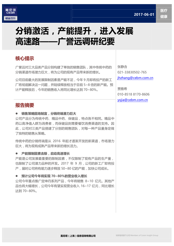 本报告通过对广誉远销售策略、产能扩张以及市场前景的分析,揭示了公司未来发展的潜力。广誉远通过差异化的销售策略,尤其是在分销渠道的拓展上,有望进一步释放市场潜力。随着新工厂的投产,产能瓶颈将得到有效解决,为公司进入高速发展期奠定基础。预计公司今年将实现显著的业绩增长,其中定坤丹系列产品是重要的增长引擎。总体而言,广誉远正步入发展的高速路。