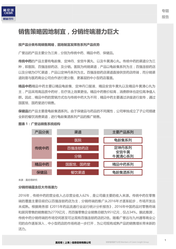 广誉远针对传统中药、精品中药、保健品三大品类,分别构建了独立的销售团队和销售策略。传统中药主要通过医院、百强连锁药店和分销渠道销售,精品中药则面向高净值人群,通过讲座和国医馆、国药堂进行销售,保健品则通过餐饮渠道进行推广。