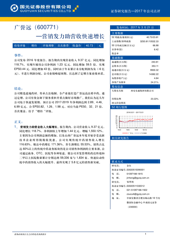 本报告分析了广誉远2016年度报告,指出公司通过营销发力实现了营收和利润的大幅增长。规模效应降低了费用率,高附加值产品提升了毛利率。基于公司良好的发展态势和未来盈利预测,国元证券首次覆盖,给予“增持”评级。