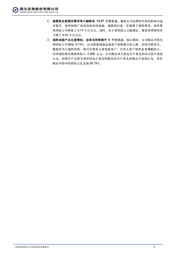 公司精品中药毛利率增加,通过讲座吸引优质客户,自营大客户销售业务增幅较大。推出双天然安宫牛黄丸和双天然牛黄清心丸,其在精品中药中的销售占比达到38.75%。