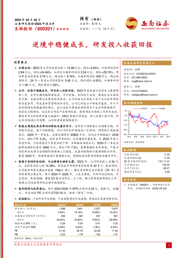 随着下游养殖业产能的持续去化,特别是生猪和能繁母猪存栏量创下四年新低,市场预计养殖周期将迎来反转,这将带动动保板块实现量价齐升。生物股份凭借其丰富的新兽药研发管线和即将获批上市的多个重磅疫苗产品,有望充分把握行业复苏带来的市场机遇。公司预计未来几年营收和净利润将持续增长,分析师维持“持有”评级,并预测2024-2026年EPS分别为0.34元、0.41元、0.52元。