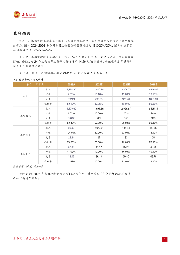 分析师预计生物股份2024-2026年每股收益(EPS)分别为0.34元、0.41元、0.52元,对应动态市盈率(PE)分别为27倍、22倍、18倍。基于对公司在养殖周期去化背景下把握龙头优势和新品推出的判断,预计2024-2026年公司兽用生物制品销售量增速分别为15%、20%、20%,销售价格保持不变,毛利率水平分别为57%、58%、59%。