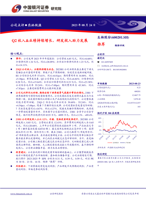 本报告分析了生物股份2023年半年度报告,指出公司营收和业绩持续增长,毛利率有所改善,研发投入力度加大,尤其是在非瘟疫苗和宠物疫苗方面。维持对公司的“推荐”评级,并提示了相关风险。
