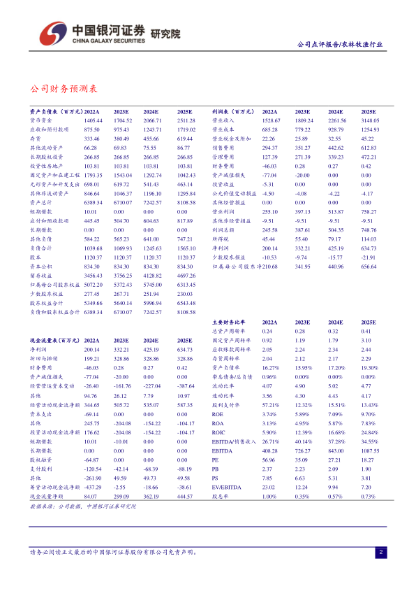 23Q1公司收入业绩双升,盈利能力改善2022年公司营收15.29亿元,同比-13.94%;归母净利润2.11亿元,同比-44.89%;扣非后归母净利润为1.96亿元,同比-47.08%;业绩下滑主要受下游生猪养殖企业22H1深度亏损,公司调整经营策略所致。公司综合毛利率55.17%,同比-6.71pct;期间费用率为33.33%,同比-1.99pct。22Q4、23Q1公司营业收入4.2亿元、3.64亿元,同比-4.03%、+6.54%;归母净利润0.01亿元、1.07亿元,同比+101.66%、+31.78%;扣非后归母净利润-0.15亿元、1.01亿元,同比+13.08%、+12.21%;销售毛利率为59.58%、59.69%,同比-1.58pct、+4.54pct,公司毛利率呈好转态势。期间费用率为43.54%、23.98%,同比-11.62pct、+3.03pct。分红预案:每10股派发现金红利0.6元(含税)。