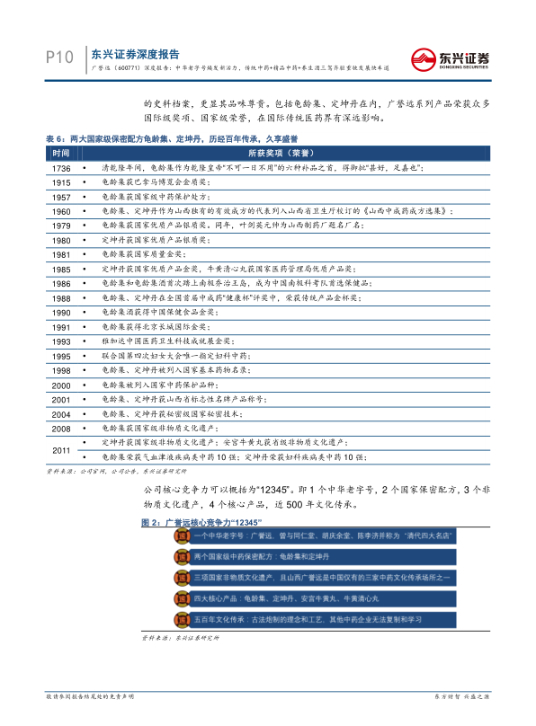 广誉远作为始创于明嘉靖二十年(公元1541年)的中华老字号,拥有477年历史,曾与广州陈李济、北京同仁堂、杭州胡庆余堂并称“四大名店”。公司是国内唯一拥有两个“国家保密品种”(龟龄集、定坤丹)和三项“国家级非物质文化遗产”(龟龄集、定坤丹及安宫牛黄丸)的企业,其核心竞争力可概括为“12345”(1个中华老字号,2个国家保密配方,3个非物质文化遗产,4个核心产品,近500年文化传承)。