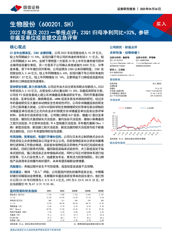 2022年报及2023一季报点评:23Q1归母净利同比+32%,参研非瘟亚单位疫苗提交应急评审